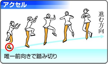アクセルは、左足外側のエッジを使って前向きに踏み切り、後ろ向きで着氷します。このジャンプは唯一前向きに踏み切るため、他のジャンプよりも半回転多く、トリプル(3回転)アクセルなら3回転半回転します。最も難しいジャンプであり、その特徴は踏み切りが他の5種類のジャンプと異なるため、見分けやすさがあります。