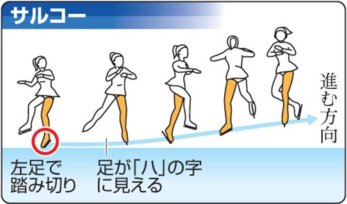 サルコウは左足内側(親指側)のエッジで滑りながら、右足を振り上げる勢いを使って跳び上がります。見分けるポイントは、踏み切る前に、踏み切る左足と振り上げようとしている右足が「ハ」の字のかたちになります。