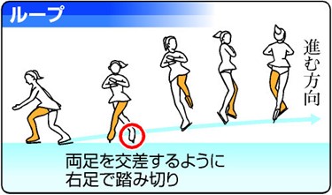ループは右足外側(小指側)のエッジで滑りながら、左足を前に出して踏み切ります。ループを見分けるポイントは、踏み切る前に腰かけるような姿勢になります。連続ジャンプの2つ目としてトウループに次いでよく跳ばれるジャンプで、トウループに比べて最初のジャンプで着氷した右足のみで踏み切るため難易度が高くなります。