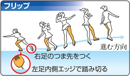 フリップは後ろ向きに入り、左足内側(親指側)のエッジに乗ってから右足のトウをついて踏み切ります。フリップとルッツでは踏み切る足は同じですが、フリップは軸足(左足)の「内側」のエッジに乗ります。したがって、跳ぶ直前に振り返る選手が多いのが特徴であり、トウループとの違いは、トウをつくのが右足であることです。
