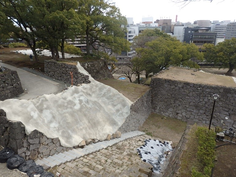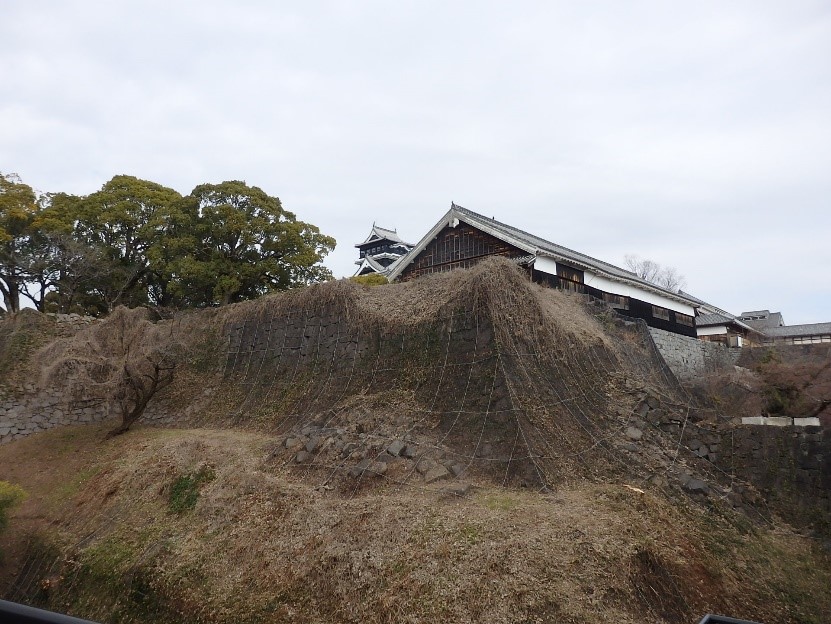 地震によって、櫓(やぐら)の土台となる石垣のほとんどが崩落しました。